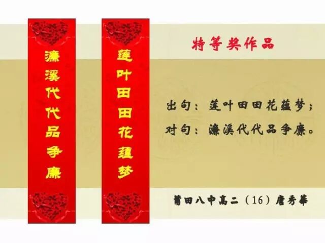 据悉,本次大赛4月起在全球发起,要求撰写有关宋代理学鼻祖周敦颐的廉政精神,以及周敦颐后代在常州横林光霁祠留下的对联的征联。经过投稿初评,除成人组外,全国有52名中小学生入围。在现场比赛中,由莆田八中祁朝洪老师带队的6名楹联学子全部获奖。其中一名获大赛唯一的特等奖,1名获二等奖,1名获三等奖,其余3名获优秀奖。