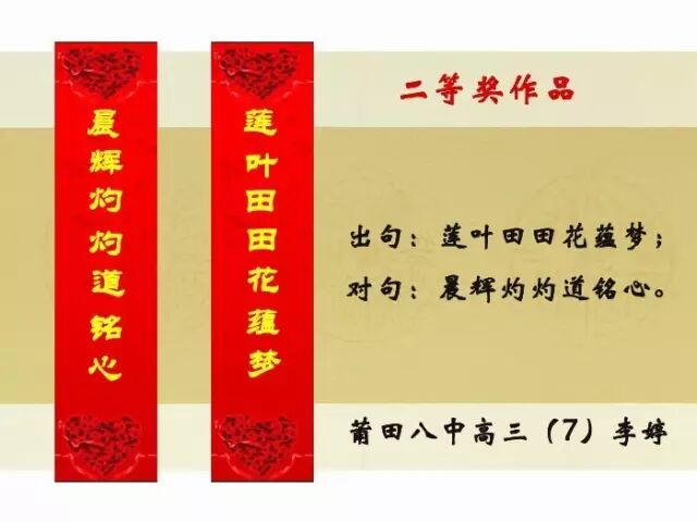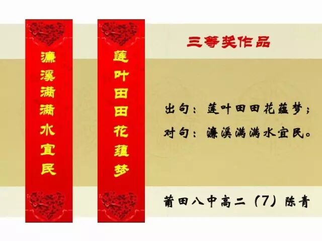 在江苏省常州市举行的“爱莲杯”全球诗词联大赛暨全国第三届中小学生大赛总决赛中,莆田楹联协会的6名参赛学生全部获奖。来看看我们的获奖佳作.......